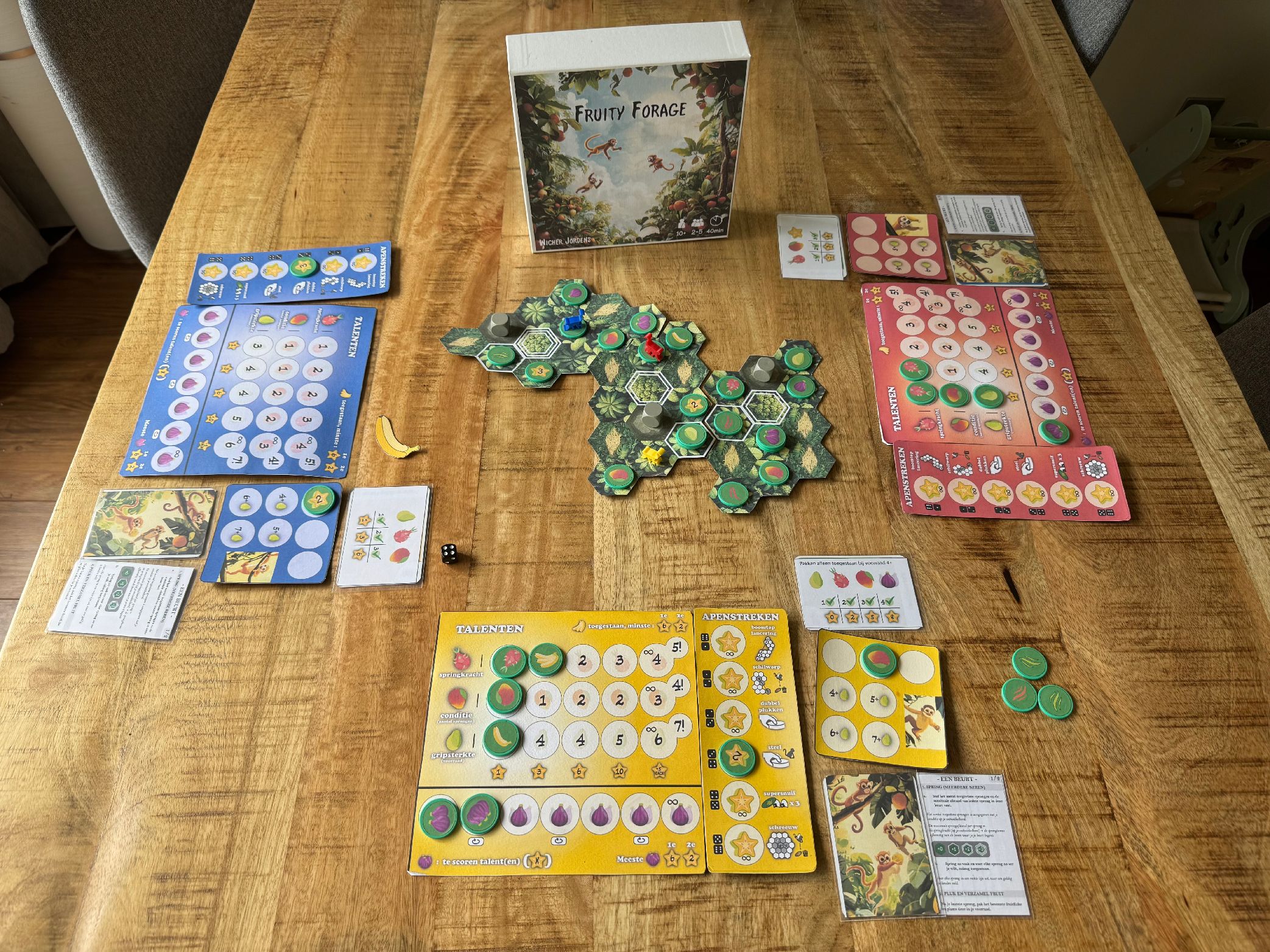 Fruity Forage is een (3D) hexagonaal bewegings- en verzamelspel waarin je als doodskopaapje van boom naar boom springt op zoek naar het fruit dat steeds het beste past bij jouw beoogde maaltijd, en je zo de meeste overwinningspunten oplevert.