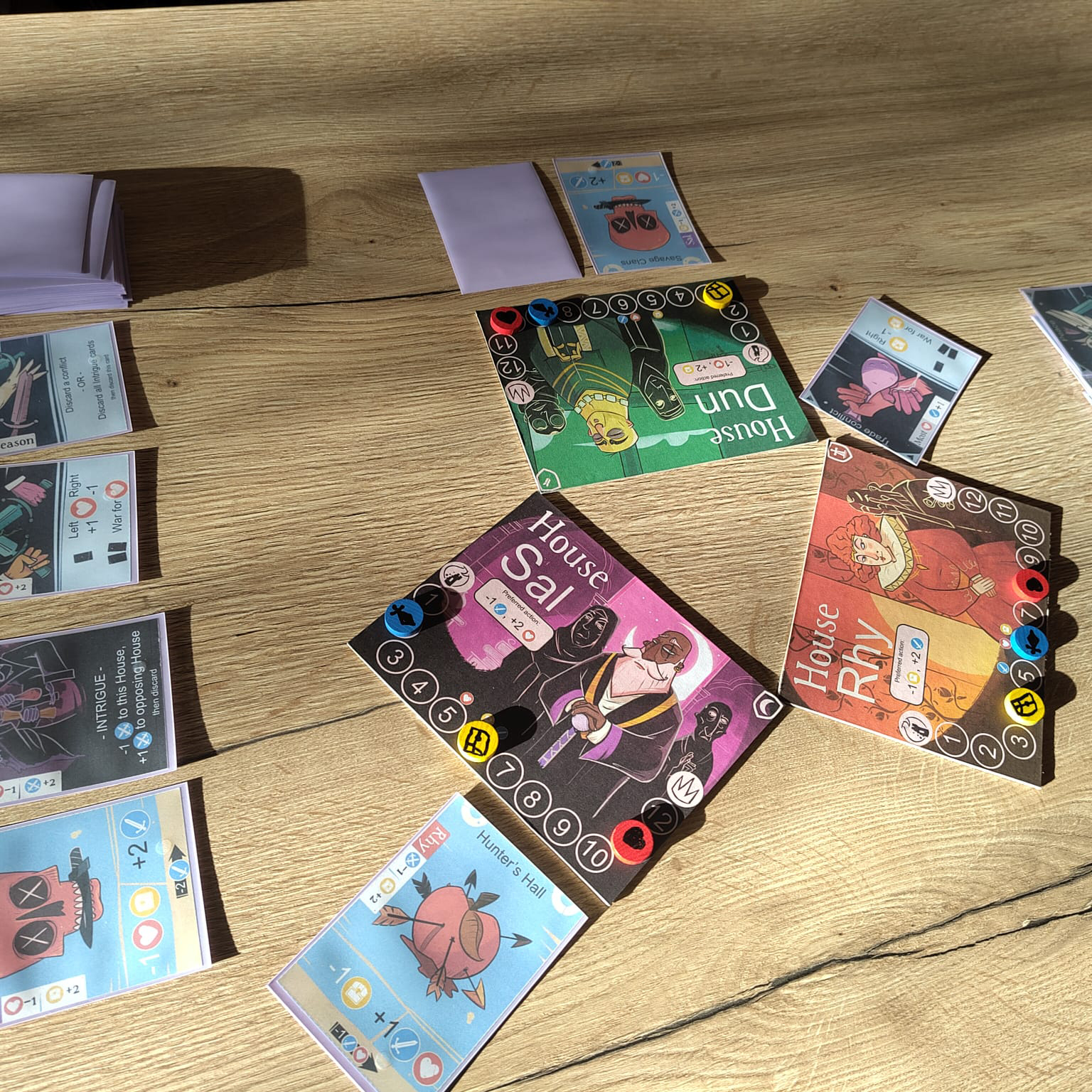 Council of Serpents is a 30 min, 1-4 player tug of war game in which you do not know the directions your opponents are pulling. Three great Houses are vying for power, but you are not one of them. You manipulate these Houses for your own gain, and want to orchestrate either the triumph or collapse of a House.